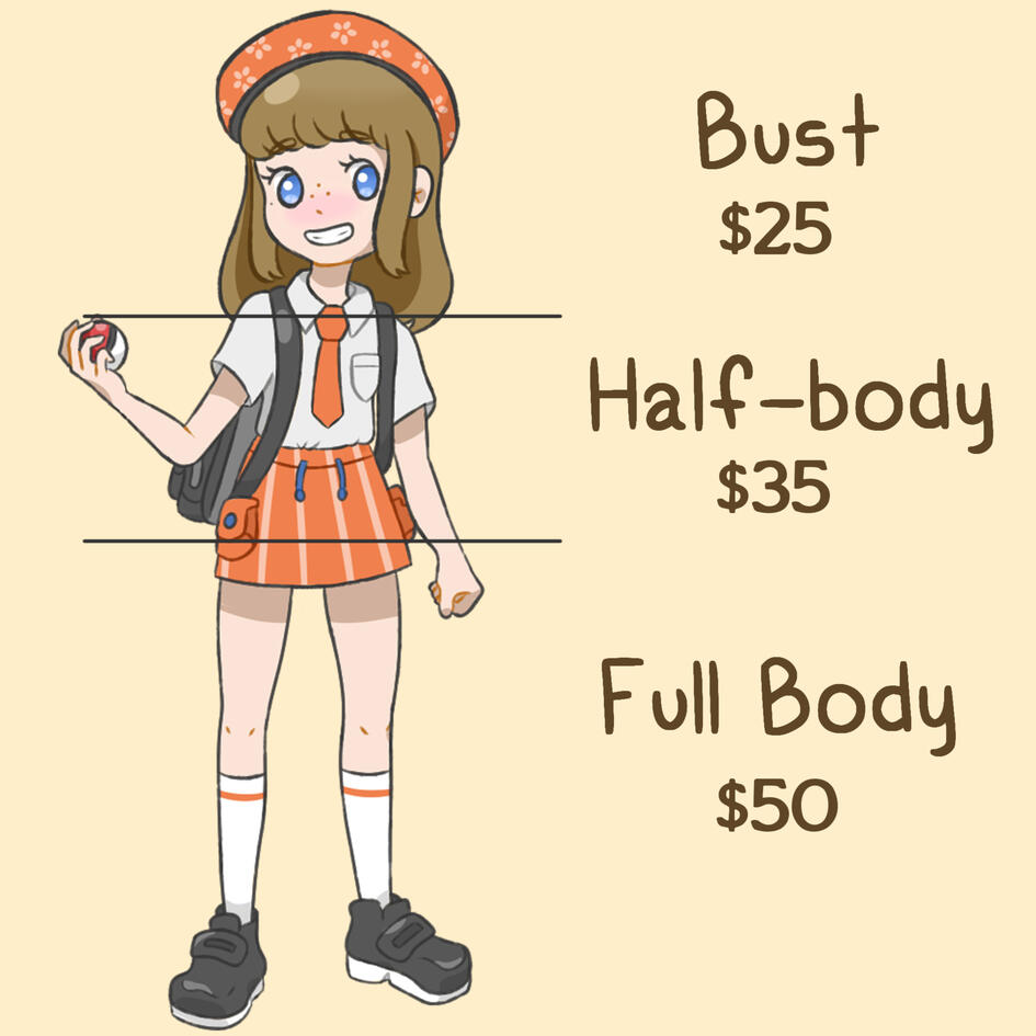 Below are some examples of the types of commissions that I do and their prices! If you are interested in any, please be sure to read through my Terms of Service page (link at the bottom of this page). Please note that all prices are in USD and subject to change depending on the details/complexity of the individual commission.